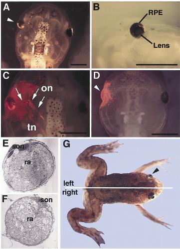 Fig. 5. The grafted eye formed in vitro connected to the recipient and this eye was retained after metamorphosis. (A) Dorsal view of the recipient 15days post- transplantation. The grafted eye was observed at the left side of the recipient (white arrowhead). (B) Lateral view of the recipient. RPE and lens could be seen. (C) High magnification view of A showing TRDA signal (red fluor- escence) on the grafted eye. Note that the optic nerve extended from the grafted eye; the white arrow indicates TRDA signal corresponding to the extending optic nerve. on, optic nerve; tn, trigeminal nerve. (D) TRDA- labeled animal caps were trans- planted into the tadpoles at stage 33 as a negative control for the transplantation procedure. Eye structures were not induced in these grafted tissues (white arrowhead). (E,F) Electron micro- scopy of the optic nerve of normal eye (E) and the transplanted eye (F). The optic nerve extending from grafted eye had the same structure as a normal optic nerve. son, sheath of optic nerve; ra, retinal axon. (G) External view of a juvenile frog. After metamorph- osis, the grafted eye bonded with the host frog. Black arrowhead indicates the transplanted eye (left side of the frog), suggesting that the grafted eye connected to the host tadpole after meta- morphosis. Scale bar indicates 1 mm (A-D). |