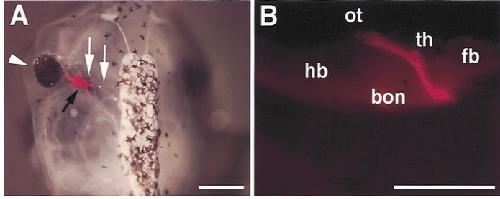 and the labeled optic nerve reached the tectum of the host brain. fb, forebrain; hb, hindbrain; ot, optic tectum; th, thalamic visual center; bon, basal optic nucleus. Scale bar indicates 1 mm (A, B). |