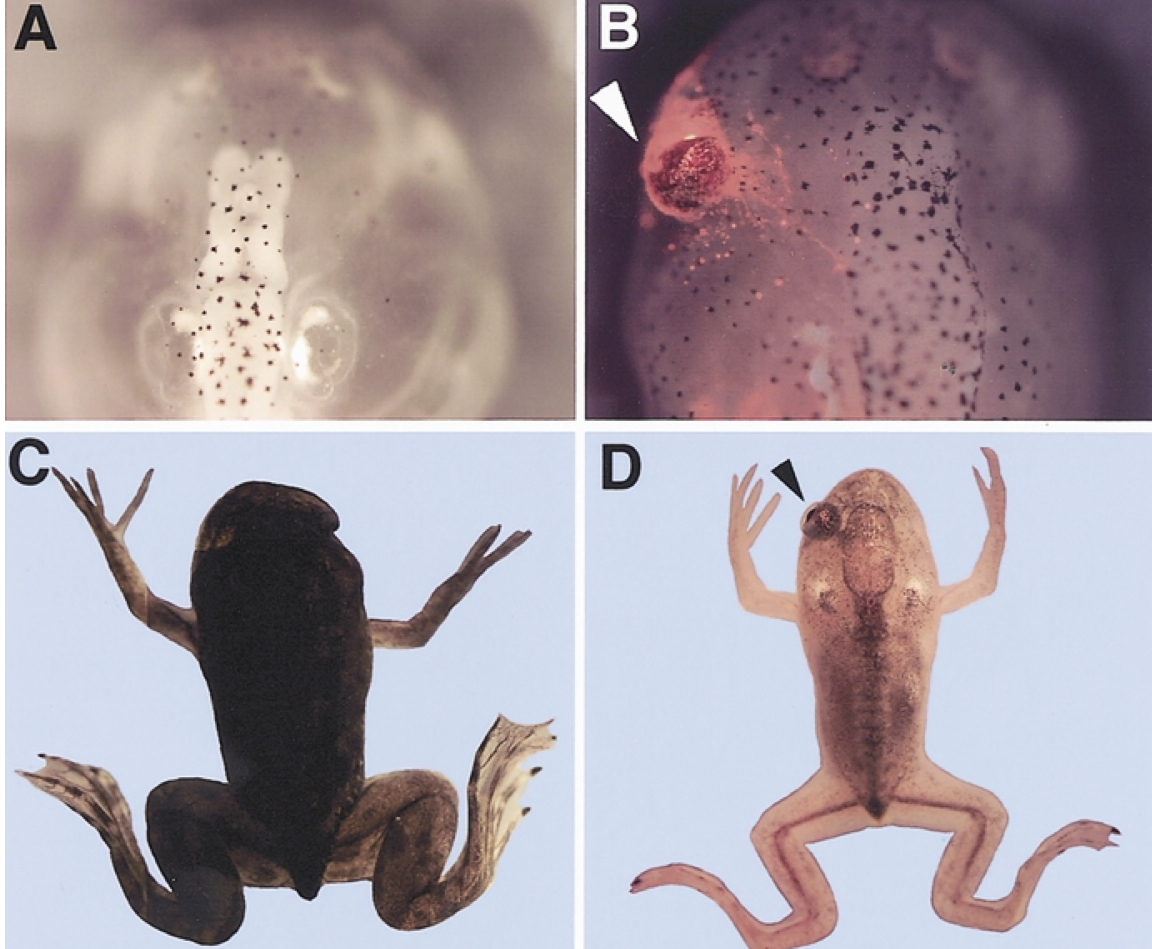 Fig. 7. The eye induced In vitro shows normal function. (A,B) Dorsal view of stage 50 tadpoles. The tadpole with both eyes removed at stage 33 (A) and the transplanted TRDA-labeled eye induced in vitro (B). (C,D) External view of a juvenile frog. (C) The control eyeless frog was a dark color. (D) The frog with the grafted eye formed in vitro was a light color. These results suggest that the frog with the grafted eye formed in vitro could sense the brightness of its surroundings using the transplanted eye and was thereby able to control its skin color. |