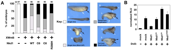 Figure 2. Wild-type Nkd1 but not mutant Nkd1 inhibits Wnt/β-catenin signaling.(A) % Xenopus embryos with indicated axis phenotype after injection of XWnt8+/âwild-type or mutant NKD1. (n)â=â# embryos injected. Panels at right show representative lateral (L) and dorsal (D) views of embryos scored as single axis (white), short A/P axis (light gray), partial axis duplication (dark gray), and full axis duplication (black) according to the Materials and Methods. In embryos with single axis in the left panels, note trunk (white arrow) and cement gland (black arrow). Arrowheads designate each axis in embryos with axis duplications (right panels). Embryos with partial axis duplication have duplicated trunktissue but a single cement gland, while embryos with full axis duplication have duplicated trunk tissues and cement glands. (B) Normalized TOPflash luciferase activity (RLU) in HEK-293 cells transfected with reporter +/âDvl2 +/â indicated Nkd1 construct.