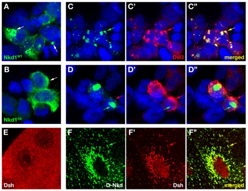 Figure 4. Nkd1 truncation alters subcellular localization and Dvl colocalization.(A, B) HEK-293 cells expressing HA/Flag-tagged Nkd1 (A) or Nkd1C8 (B) stained with α-HA (green). Nkd1 accumulates in puncta (arrows), while Nkd1C8 is diffusely distributed in the cytoplasm. Nkd1C6 distributed in a pattern similar to Nkd1C8 (not shown). (C, D) Cells co-expressing Dvl3 and wild-type (C) or C8 (D) Nkd1GFP constructs. Nkd1-GFP (green, C) shows near complete colocalization (arrows) with Dvl3 (red, C′), while Nkd1C8-GFP (D) accumulates in cytoplasmic aggregates surrounded by Dvl3 (arrows). Merged images are in C″, D″, DNA is blue in A–D. Similar results were observed in cells coexpressing Nkd1C8-GFP and Dvl1 or Dvl2, and in cells expressing Nkd1C6-GFP and Dvl1, Dvl2, or Dvl3 (not shown). (E) Salivary gland from wild-type third instar Drosophila larva stained with α-Dsh (red) showing diffuse and punctate staining. (F–F″) A8-Gal4/UAS-NkdGFP salivary gland stained with α-Dsh and imaged for GFP (F) and Dsh (F′; merged in F″). Fly NkdGFP relocalizes Dsh to perinuclear aggregates (arrows) similar to those observed with Nkd1GFP/Dvl3 in C.
