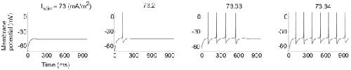 Ion channel density and threshold dynamics of repetitive firing in a cortical neuron model.