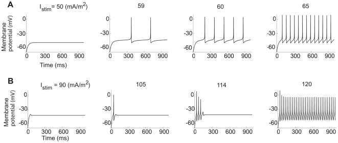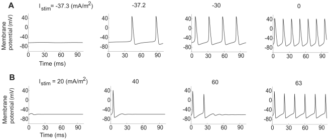 Figure 11. Exclusively Type 2 dynamics in the squid axon model.The time-course of the membrane voltage with increasing steady current for low and high K channel densities. (A) = 1200 S/m2 and = 50 S/m2. Onset frequency is 22 Hz. (B) = 1200 S/m2 and = 360 S/m2 (values used by Hodgkin and Huxley in their original study from 1952 [23]). The onset frequency is 52 Hz.