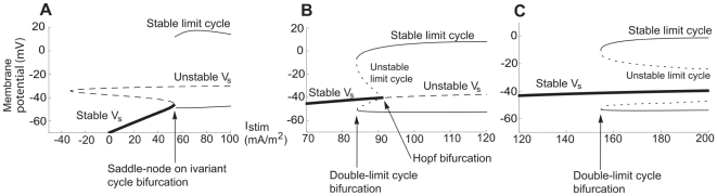 Figure 3. Bifurcation diagrams for the hippocampal neuron model.(A) A saddle node bifurcation in region C1. There are three stationary voltages in the Istim range of −40 to +50 mA/m2. The oscillations occur when the stable stationary potential Vs1 merges with a saddle point voltage Vs2. Type 1 threshold dynamics is generated if the limit cycle involves the merged point, i.e. a saddle-node bifurcation on an invariant circle (SNIC). = 20 µm/s, = 2 µm/s. (B) Subcritical Andronov-Hopf and double-limit cycle bifurcations in region B, = 20 µm/s, = 10 µm/s. The oscillations emerge at Istim = 84 mA/m2, thus when the corresponding stationary point/voltage still is stable. The loss of stability is due to a double-limit cycle bifurcation, characterized in the variable space by the simultaneous appearance of two limit cycles of opposite stability, one yielding stable and persistent oscillations. This bifurcation is not detectable by the Jacobian matrix of the stationary point; instead the bifurcation depends on the global properties of the variable space. The local Andronov-Hopf bifurcation (also named degenerate Andronov-Hopf bifurcation because of the way the limit cycles collapse onto the equilibrium point [21], [29]) occurs at Istim = 92 mA/m2. There is also an additional Andronov-Hopf bifurcation at higher Istim (524 mA/m2, now shown) that terminates the oscillations. (C) For higher values of (region A2) these two Andronov-Hopf points collide and disappear (the non-transversal Andronov-Hopf bifurcation), after which no Andronov-Hopf points are present = 20 µm/s, = 20 µm/s.