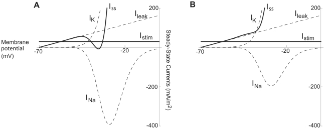 Figure 4. Prerequisites for three stationary potentials (defining region C1).Steady-state currents versus membrane voltage for the hippocampal neuron model. Calculated from Equation 17. The Na channel density is varied while other parameters are maintained constant to demonstrate the requirement of a high Na channel density to obtain three stationary potentials. Inward currents are shown as positive. (A) = 30 µm/s and = 5 µm/s. (B) = 11 µm/s and = 5 µm/s.