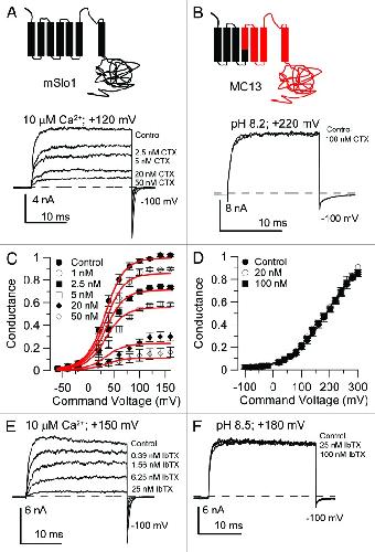 Figure 1. Slo3 is insensitive to block by CTX and IbTX. In (A), traces show block by cumulative application of CTX to an outside-out patch, with currents activated with 10 um Ca2+ at +120 mV. Cartoon on the top diagrams the Slo1 topology showing transmembrane segments and the cytosolic domain. In (B), 100 nM CTX is without effect on currents through the Slo3 surrogate construct, MC13. Currents were activated with a pipette saline of pH 8.2 with a depolarizing voltage step to +220 mV. The cartoon shows the MC13 topology with red elements originating from Slo3 and black elements from Slo1. See Methods for precise segment boundaries. In (C), Slo1 G/V curves are shown for different CTX concentrations. Red lines correspond to a fit of a state-independent blocking scheme (Scheme 2a) with Kb = 6.1 ± 0.3 nM and no voltage-dependence during the time of each voltage-step. In (D), the effect of 20 and 100 nM CTX on MC13 G/V curves is shown. In (E), traces shown Slo1 currents during progressive increases in IbTX concentration to an outside-out patch with 10 μM pipette Ca2+ and activation steps to +150 mV. For comparison to other studies, fitting the fractional block of current by IbTX for values at +40 mV with a Hill equation yields a Kd = 0.5 ± 0.3 nM (nH = 1). In (F), MC13 currents are insensitive to application of 25 and 100 nM IbTX to an outside-out patch (activation with pipette pH of 8.5 at +180 mV). |