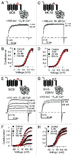 Figure 2. Slo1 CTX sensitivity arises primarily from Y294 with small contributions from other elements in the turret segment. In (A), traces show the lack of effect of 100 nM CTX on currents through construct MC6 (inset), in which the Slo1 P-loop is replaced with Slo3 sequence. In (B), G/V curves for MC6 activated with 10 μM Ca2+ are shown in the absence and presence of CTX. Red lines correspond to fits of a simple Boltzman function. In (C), traces show the lack of effect of 100 nM CTX on construct MC18, in which the 2nd half of the P-loop (selectivity filter and pore helix) were replaced with Slo3 sequence. In (D), G/V curves for the MC18 construct activated with 10 μM Ca2+ are shown. In (E), traces show that CTX readily blocks currents through construct MC8, in which the first half of the P-loop (primarily presumed turrent sequence) was replaced with Slo3 sequence. In (F), G/V curves for MC8 activated with 10 μM Ca2+ are shown at different CTX concentrations. Red lines correspond to the best fit of a state-independent blocking model (Scheme 2) with Kb = 10.4 ± 0.3 nM. In (G), traces show weak blocking effects of CTX on currents through Slo1-Y294V. In (H), effects of CTX on the Slo1-Y294V G/V curves are plotted for 10 μM Ca2+. |