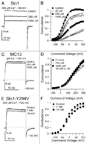 Figure 3. The Slo3 surrogate, MC13, is relatively insensitive to block by extracellular TEA in comparison to Slo1. In (A), application of TEA to outside-out patches inhibits Slo1 current. In (B), the effect of TEA on the Slo1 G/V curve generated with 300 μM pipette Ca2+ is shown. The solid lines are the best fit of a state-independent blocking model (Kb = 173.9 ± 8.0 μM; zδ = 0.23 ± 0.02 e). Block is relieved with depolarization. In (C), traces show weak blocking effects of extracellular TEA on MC13 currents in outside-out patches. In (D), extracellular TEA has minimal effect on MC13 G/V curves. In (E), mutation of Y294V in Slo1 abolishes most of the sensitivity of Slo1 to TEA. In (F), G/V curves summarize the lack of effect of TEA on the Slo1-Y294V construct. |