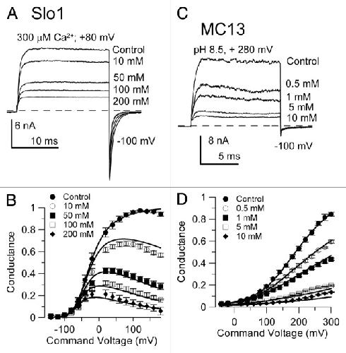 Figure 4. MC13 is more sensitive than Slo1 to block by cytosolic TEA. In (A), traces show Slo1 current activated at +80 mV with 300 μM Ca2+ in the indicated concentrations of cytosolic TEA. In (B), G/V curves are shown for set of 4–5 patches with the lines showing the best fit of an open channel blocking model (Kb = 49.0 ± 3.2 μM; zδ = -0.15 ± 0.02 e). In (C), traces show MC13 currents activated with pH 8.5 at +280 mV at the indicated cytosolic TEA concentrations. In (D), G/V curves are shown for a set of 6 patches with the lines showing the best fit of an open channel block model (Kb = 0.11 ± 0.01 μM; zδ = 0.12 ± 0.01 e, with the maximal fractional conductance at +300 mV assumed to be 0.35,5,6). A state-independent model did not fit as well (see text and Suppl. Fig. 3). |