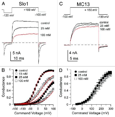 Figure 5. MC13 is relatively insensitive to block by extracellular 4-AP compared to block of Slo1. In (A), Slo1 currents were activated in outside-out patches by the indicated voltage-protocol with 300 μM Ca2+ (pH 8.5) inside the recording pipette. Application of 25 and 100 mM 4-AP resulted in substantial block of outward BK current. In the presence of 4-AP, activation at +100 mV is noticeably slowed, consistent with time-dependent unblock. In contrast, tail currents at -100 mV (red trace) in the presence of 4-AP decay more rapidly than in the absence of 4-AP and exhibit more block at the negative potentials. The pH of the extracellular solution was 7.0. In (B), G/V curves from traces such as those in (A) were generated from steady-state currents. Red lines are the best fit of the open channel block scheme with Kb(0) = 5.19 ± 0.41 mM and zδ = 0.60 ± 0.03 e, consistent with a relief from block at more positive cytosolic voltages. In (C), MC13 currents were activated by the indicated voltage-protocol with the pipette solution at pH 8.5. 4-AP was much less effective in blocking MC13 than BK currents. In (D), G-V curves for MC13 currents were generated again revealing the relative lack of effect of extracellular 4-AP on MC13. |