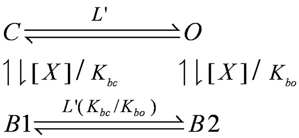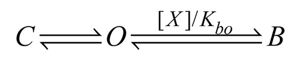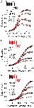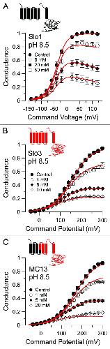 Figure 6. Cytosolic 4-AP blocks Slo3/MC13 more effectively than it blocks Slo1. In (A), G/V curves were generated for Slo1 currents activated with 300 μM Ca2+ (pH 8.5) in inside-out patches with various concentrations of 4-AP. Red lines are the best fit of Scheme 2a, the state-independent block model, with Kb = 30.7 ± 1.3 mM with zδ = 0.1 ± 0.02 e. In (B), G/V curves were generated for Slo3 currents activated with pH 8.5 and fit with Scheme 1, the open channel block model (Kb = 2.5 ± 0.5 mM with zδ = 0.02 ± 0.03 e. In (C), G/V curves were generated for MC13 currents activated in inside-out patches with pH 8.5 and fit with Scheme 1 (Kb = 2.1 ± 0.2 with zδ = 0.02 ± 0.01 e). |
