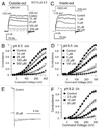Figure 9. Block of MC13 by either extracellular or intracellular quinidine shows a similar relief with depolarization. In (A), MC13 currents were activated in an outside-out patch with the indicated voltage-protocol with a pipette saline of pH 8.5. Quinidine (pH 7.0) was applied to the extracellular side of the patch. In (B), G/V curves for MC13 currents activated in various quinidine concentrations show relief of block at more positive potentials, particularly at higher quinidine concentrations. Lines correspond to a fit of Eqn. 2 (Scheme 2a; state-independent channel block) with Kb = 11.42 ± 1.44 μM (zδ = 0.13 ± 0.01 e from the outside). In (C), traces show MC13 currents activated in an inside-out patch at pH 8.5 with the indicated quinidine concentrations. In (D), G/V curves from MC13 currents are plotted for the indicated quinidine concentrations. Lines show the best fit with Scheme 2a, a state-independent blocking model, with Kb = 1.97 ± 0.34 μM with zδ = 0.13 ± 0.02 e. In (E), traces are tail currents from (C) for control and 25 μM quinidine solutions, highlighting persistence of block with repolarization. In (F), G/V curves for MC13 currents obtained in inside-out patches at pH 8.2 with various quinidine concentrations are shown, with the best fit (Eqn. 2) yielding Kb(0) = 0.98 ± 0.03 μM, with zδ constrained to 0.13 e. |