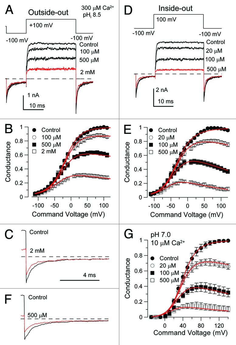 Figure 8. Block of Slo1 by extracellular or intracellular quinidine is increased by depolarization. In (A), the indicated voltage-protocol was used to elicit Slo1 currents activated with a cytosolic solution containing 300 μM Ca2+ at pH 8.5. Each trace was with a different concentration of extracellular quinidine (pH 7.0). In (B), G/V curves for Slo1 current activation in the presence and absence of quinidine exhibit increased block at more positive potentials. Red lines correspond to the fit of Eqn. 1 with Kb(0) = 0.95 ± 0.02 mM (zδ = 0.05 + 0.01 e). In (C), tail currents following repolarization are shown on an expanded time base for the control trace and 2 mM quinidine trace (red) from (A), revealing rapid unblock upon repolariztion. In (D), traces show Slo1 currents in an inside-out patch activated with the indicated voltage-protocol with 300 μM cytosolic Ca2+ at pH 8.5 and the indicated quinidine concentrations. In (E), G/V curves for Slo1 currents with various quinidine concentrations are plotted along with a fit of Scheme 1, an open-channel block model, with Kb(0) = 142.9 + 3.4 μM (zδ = 0.18 ± 0.01 e). In F, traces are tail currents from (D) for control and 500 μM quinidine solutions. The fractional reduction of peak instantaneous current at -100 mV is reduced relative to the fractional reduction of steady-state current at +100 mV. In (G), Slo1 G/V curves were generated from inside-out patches with 10 μM Ca2+ at pH 7.0 and the indicated quinidine concentrations with the best fit of Eqn. 1 yielding Kb(0) = 92.8 ± 9.8 μM with zδ = 0.11 ± 0.03 e. |
