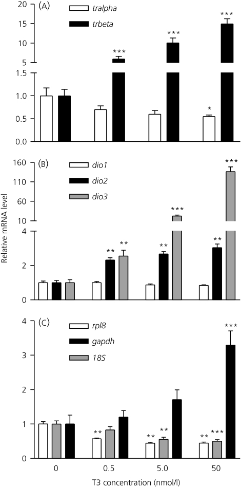 Fig. 3. Effects of triiodothyronine (T3) exposure on the expression of thyroid hormone-related genes in Silurana tropicalis premetamorphic tadpoles. Silurana tropicalis (Nieuwkoop and Faber stage 52–54) were exposed to T3 (0, 0.5, 5, 50 nm) for 48 h. Effects of T3 on tralpha and trbeta (a), dio1, dio2 and dio3 (b) and the reference genes rpl8, gapdh and 18S (c) are presented. Data are presented as the fold changes relative to control and are normalised to RNA content (note the broken y-axis for a and b). Bars represent the mean ± SEM. Asterisks represent significant differences from the control group (n = 8 pools; *P<0.05; **P<0.01; ***P<0.001). Note that the scales of the y-axis vary between genes.