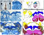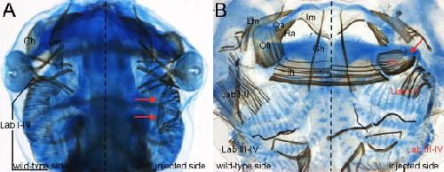 Fig. S2. Muscular alterations in 5-HT2B-overexpressing tadpoles (stage 49). (A,B) 5-HT2B-overexpressing embryos double stained for cartilage (blue) and muscle (brown) in whole-mount (dorsal view, A) and flat-mount (B) preparations. Note the muscular alterations on the injected side of the embryo: the levatores arcuum branchialum muscles I-II (Lab I-II) are disorganized (red arrows in A) and the orbitohyoideus muscle (Oh) is anchored to the ectopic cartilage (red arrow in B) instead of to the reduced quadrate, as on the wild-type side. |