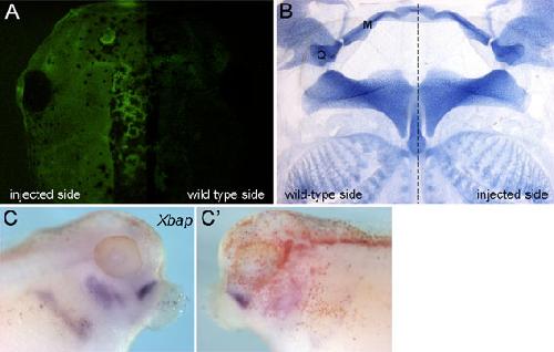 Fig. S3. Co-injection of 5-HT2B mRNA with 5-HT2B-MO1 rescues both the skeletal and molecular phenotypes. (A) Dorsal view of a stage 49 Xenopus embryo co-injected with 5-HT2B mRNA and 5-HT2B-MO1. The injected side of the embryo is visualized by the GFP fluorescence. (B) Flat-mount preparation of the skeleton of an embryo co-injected with 5-HT2B mRNA and 5-HT2B-MO1 and stained with Alcian Blue. The injected side of the embryo is normal. (C,C′) Lateral views of a stage 37 embryo co-injected with 5-HT2B mRNA and 5-HT2B-MO1 and hybridized with the Xbap probe. There are no differences in the Xbap mRNA expression on the wild-type (C) and injected (C′) sides of the embryo. |