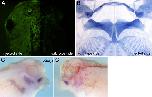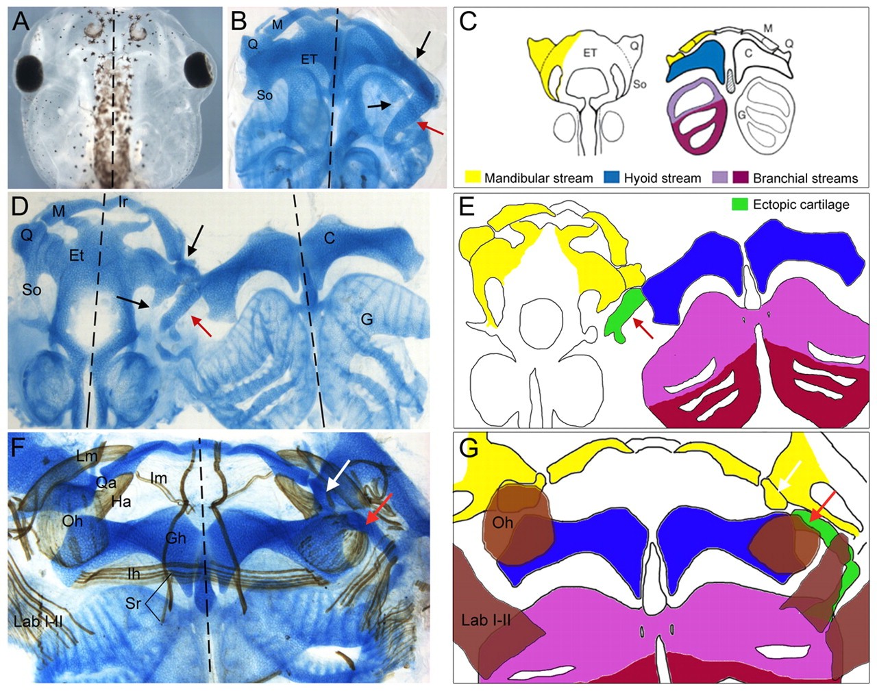 Fig. 1. Skeletal and muscular alteration in 5-HT2B-overexpressing tadpoles (stage 49). (A) Dorsal view of a 5-HT2B-overexpressing embryo. (B,D) Alcian Blue-stained whole-mount (B) and flat-mount (D) skeleton of injected embryos. Red arrows indicate the ectopic cartilage and black arrows indicate the reduction of the quadrate (Q) and subocular (So) cartilages. (C,E) Scheme of the contribution of cranial NCC streams to the neurocranium and pharyngeal skeleton of Xenopus laevis as reported by Pasqualetti et al. (Pasqualetti et al., 2000) (C) and in 5-HT2B-overexpressing embryos (E). (F) Flat-mount of an injected embryo double stained for cartilage (blue) and muscles (brown). (G) Scheme of muscular alterations of the 5-HT2B-overexpressing embryo shown in F. On the injected side, the orbitohyoideus muscle (Oh) is anchored to the ectopic cartilage (red arrow in F,G) instead of to the reduced quadrate (white arrow in F,G). Note the disorganization of the levatores arcuum branchialum muscles I-II (Lab I-II) on the injected side. C, ceratohyal; Et, ethmoidal plate; G, genohyoideus; Ha, hyoangularis; Ih, interhyoid muscle; Im, intermandibular; Ir, infrarostral; M, Meckel's; Qa, quadratoangularis; Lm, levator mandibulae; Sr, subarcuales rectus. |