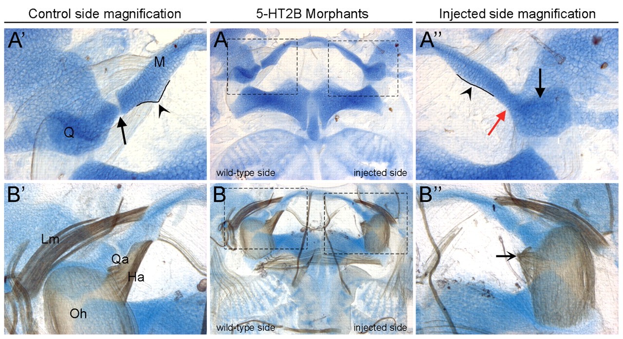 Fig. 6. Skeletal and muscular connectivity alterations in 5-HT2B morphants. (A) Flat-mount preparation of an Alcian Blue-stained 5-HT2B-MO-injected Xenopus embryo. (Aâ²,Aâ²) Magnification of the jaw joint region of the control (Aâ²) and injected (Aâ²) side of the embryo in A. Note the lack of the jaw joint (red arrow in Aâ²) compared with the uninjected side (arrow in Aâ²), the reduction of the quadrate (Q; black arrow in Aâ²), and the absence of the ventral cartilaginous muscular process of the Meckel's cartilage, which is present on the control side (arrowhead in Aâ² and Aâ², respectively). (B) Flat-mount preparation of a 5-HT2B-MO-injected embryo double stained for cartilage and muscle. (Bâ²,Bâ²) Magnification of the jaw joint region of the uninjected (Bâ²) and injected (Bâ²) sides of the embryo in B. Note the abnormal development of the hyangularis (Ha) and quadratoangularis (Qa) muscles (arrow in Bâ²). |