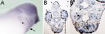 Fig. S1. 5-HT2B mRNA expression in migrated cranial NCCs. In situ hybridization with the 5-HT2B probe. (A) Lateral view of a wild-type stage 28 Xenopus embryo. 5-HT2B mRNA is expressed in NCCs that have migrated into the four branchial arches and in the heart primordia (arrow). (B) Cryostat coronal section of a wild-type stage 37 embryo. 5-HT2B mRNA is present in scattered cells of the retina and of the neural tube (arrows). (B′) Magnification of the region highlighted in B. 5-HT2B mRNA is expressed in the cement gland (cg), in the ventricular region of the ventral diencephalon (arrowhead) and in the region surrounding the oral cavity (arrow). |