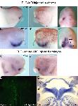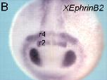 Anterior view of a late neurula stage Xenopus embryo, showing gene expression for efnb2 (ephrin B2), assayed via in situ hybridization, in rhombomere r2 and rhombomere r4, as well as eye primordium (optic field). |