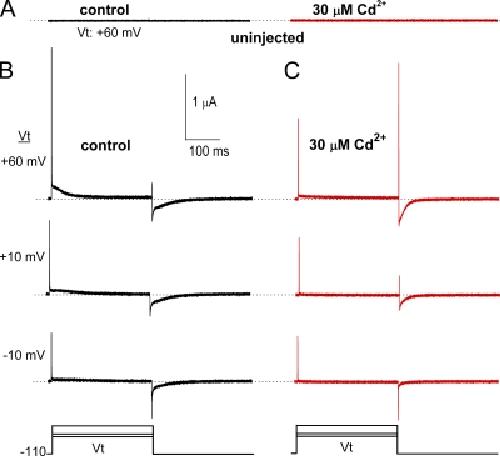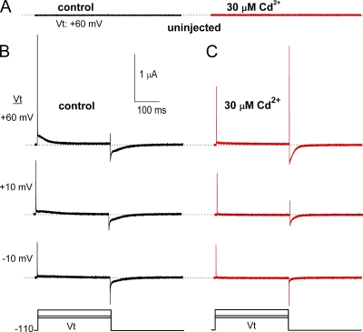 Figure 1. Effect of Cd2+ on hERG1 channel gating currents. (A) Currents recorded at a Vt of +60 mV using the COVG technique from an uninjected oocyte before (control) and 10 min after bath application of 30 µM Cd2+. Recordings were made with the same solutions used to record gating currents in oocytes expressing hERG1 channels. (B and C) Gating currents recorded at the indicated Vt before and after treatment of the same oocyte with 30 µM Cd2+. Bottom panels illustrate voltage clamp protocol used to elicit gating currents shown in panels A–C. |