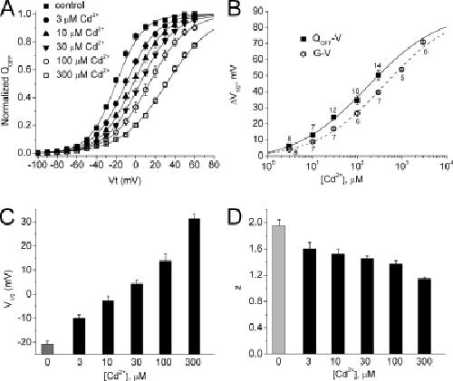 Figure 2. Extracellular Cd2+ shifts the Q-V relationship for hERG1 to more positive potentials. (A) Normalized QOFF is plotted as a function of Vt and [Cd2+]e. Averaged data for control and each [Cd2+]e were fitted to a Boltzmann function (smooth curves). (B) Plot of change in V1/2 for Q-V and G-V relationships as a function of [Cd2+]e. Data were fitted to a Hill equation to determine EC50 and Hill coefficient (nH). ΔV1/2max was set at +90 mV (Fernandez et al., 2005). For Q-V relationship, EC50 = 171 ± 13 µM; nH = 0.53 ± 0.03. For G-V relationship, EC50 = 416 ± 20 µM; nH = 0.57 ± 0.02. The number of oocytes used to calculate the average data is indicated next to each data point. (C) [Cd2+]e-dependent effects on V1/2 for Q-V relationship. (D) [Cd2+]e-dependent effects on effective valence, z, of Boltzmann function for Q-V relationship. For A, C, and D, the number of oocytes was as follows: control, 20; 3 µM Cd2+ , 8; 10 µM Cd2+, 7; 30 µM Cd2+, 12; 100 µM Cd2+, 10; 300 µM Cd2+, 14. |