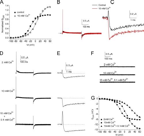 Figure 7. Elevated concentration of Ca2+ causes a positive shift in the voltage dependence of the QOFF-V relationship for hERG1, but it does not induce a transient outward component in IgOFF. (A) QOFF-V relationships for hERG1 measured under control conditions ([Ca2+]e = 2 mM) and after the elevation of [Ca2+]e to 10 mM (n = 5). Averaged data were fitted to a Boltzmann function (smooth curves). 2 mM Ca2+: V1/2 = −19.5 ± 0.5 mV and z = 1.87 ± 0.05; 10 mM Ca2+: V1/2 = 6.8 ± 1.9 mV and z = 1.42 ± 0.06. (B) Ig traces recorded in the presence of 2 mM Ca2+ (control) and 10 mM Ca2+ at a test potential of +60 mV. IgOFF was measured at −110 mV. (C) IgOFF traces from B are shown at expanded time (initial 5 ms) and amplitude scales. (D) Gating currents of WT hERG1 channels measured during 300-ms pulses to +40 mV with a holding and return potential of −110 mV. QOFF-V relationships are shown in G. Extracellular concentrations of Ca2+ and Cd2+ are indicated to the left of the current traces. (E) Expanded view of initial IgOFF for the traces shown in D. (F) Currents recorded from an uninjected oocyte using the same pulse protocol as in D with the indicated concentrations of extracellular divalent cations. (G) QOFF-V relationship determined in a single oocyte in the presence of the indicated concentrations of extracellular Ca2+ and Cd2+. For 2 mM Ca2+: QOFF-max = −8.0 nC, V1/2 = −19.6 mV, and z = 2.2. For 10 mM Ca2+: QOFF-max = −12.0 nC, V1/2 = +7.3 mV, and z = 1.6. For 10 mM Ca2+ + 0.1 mM Cd2+: QOFF-max = −9.3 nC, V1/2 = +32 mV, and z = 1.1. |