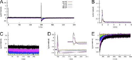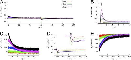 Figure 12. Averaged and normalized Ig of WT hERG1 channels measured using p/−8 leak and capacitance current subtraction. (A) Ig in response to test voltages Vt of −60, −30, …+60 mV during 0–300 ms. The membrane voltage is clamped to −110 mV otherwise. (B and C) IgON at 0–10 ms and 10–300 ms, respectively. (D and E) IgOFF at 300–310 ms and 310–600 ms, respectively. |