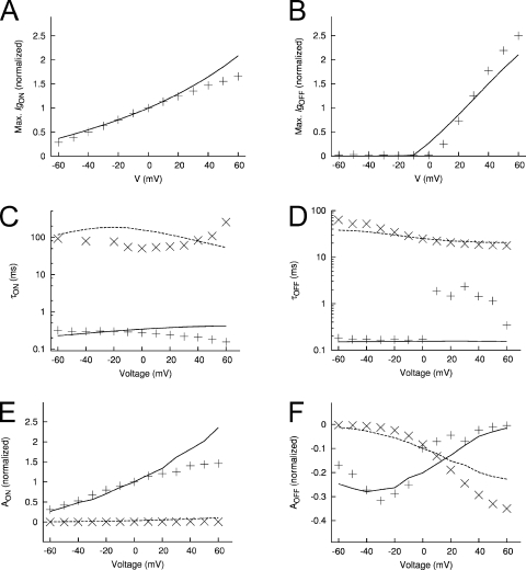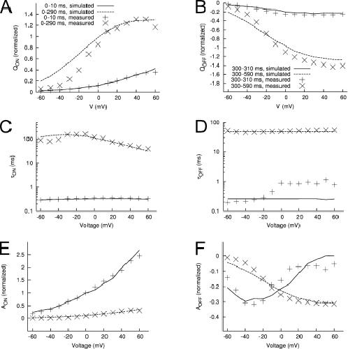 Figure 18. Features of measured and modeled Ig in the presence of extracellular Cd2+. (A) Maximal IgON-Vt relationship. (B) Maximal IgOFF-Vt relationship. Time constants–Vt relationships for IgON (C) and IgOFF (D). Relationship of exponential fit coefficients to Vt for IgON (E) and IgOFF (F). |