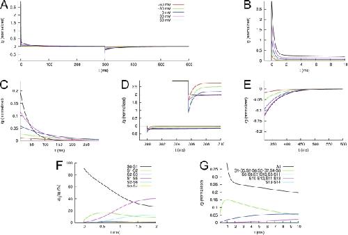 Figure 15. Modeled Ig of WT hERG1 channels. (A) Ig in response to the voltage-clamping protocol used in Fig. 12. (B and C) IgON at 0–10 ms and 10–300 ms, respectively. (D and E) IgOFF at 300–310 ms and 310–600 ms, respectively. (F) The initial phase (0–1 ms) of IgON is primarily carried by the fast transition between S0 and S1. (G) The slow decay of IgON between 2 and 10 ms is caused by a mixture of increasing and decreasing gating currents associated with the slow transitions in the gating model. |