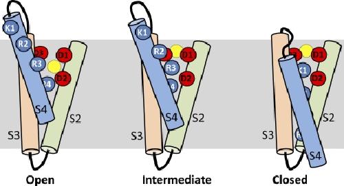 Figure 20. Schematic showing state-dependent positions of Cd2+ and key charged residues in S2–S4 segments of the VSD of a single hERG1 channel subunit. According to this model, Cd2+ is displaced in an outward direction by basic residues in the S4 segment as it moves inward in response to membrane repolarization. (Left) VSD at depolarized potentials and Cd2+ in its “depolarized” coordination site. (Right) VSD at a negative transmembrane potential when all channels are closed and Cd2+ located in a position defined as the “repolarized” coordination site. (Middle) A putative intermediate state of the channel. K1, K525; R2, R528; R3, R531; R4, R534; D1, D456; D2, D460; D3, D509. The yellow circle represents a Cd2+ ion. |