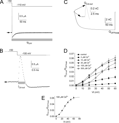 Figure 5. Effect of [Cd2+]e on the magnitude of ICd-out. (A) IgOFF in the presence of 30 µM Cd2+. Arrows indicate zero current level. Gray bar indicates region of IgOFF integrated to obtain total QOFF. (B) ICd-out shown in A, plotted on an expanded time scale. Gray bar indicates the region of IgOFF integrated to obtain QCd-out. (C) Integral of IgOFF. Inset shows QOFF at greater resolution. (D) Plot of QCd-out/QOFF total as a function of Vt and [Cd2+]e. Also shown is a plot of QCd-out versus Vt for control conditions. (E) Plot of QCd-out/QOFF total as a function of Vt for 100 µM Cd2+ and fitted to a Boltzmann function (smooth curve): V1/2 = 27 mV; slope factor = 11.0 mV; maximum value of QCd-out/QOFF total = 0.064. |