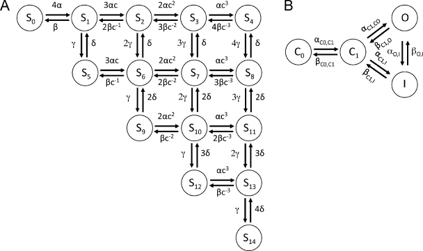 Figure 13. Schematics of Markov model for gating and ionic currents of WT hERG1 channels. The model consists of two components, one for voltage sensing with the states S0 to S14 (A) and the other for activation and inactivation with the states C0, C1, O, and I (B). The coupling between the components is via the rate coefficient αC0,C1, which is a function of the states S4, S8, S11, S13, and S14 in the component for voltage sensing. |