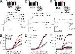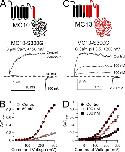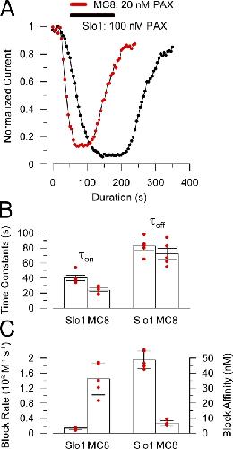 Figure 5. Replacing the first half of the Slo1 P loop with the Slo3 sequence increases paxilline block affinity and speeds up paxilline block and unblock rates. (A) The time course of onset and recovery of paxilline block for Slo1 (black) and MC8 (red) is shown for representative inside-out patches for each construct. For MC8, 20 nM paxillline was applied (horizontal bar), and 100 nM was used for Slo1. Peak current activated at +200 mV was measured every 2 (Slo1) or 3 (MC8) seconds and plotted against time. (B) Time constants of onset of paxilline block (τon) and recovery (τoff) are plotted for Slo1 (at 100 nM) and MC8 (at 20 nM). Red dots are individual determinations, and bars indicate means and SEM. (C) The forward block rate and paxilline block affinity were calculated for each individual patch for Slo1 and MC8. Block rate (left axis) and affinity (right axis) were determined from τon = 1/([PAX]kf+ku), ku = 1/τoff, and Kb = ku/kf.