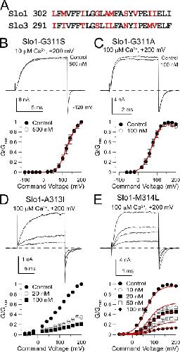 Figure 6. Mutation of glycine 311 in Slo1 S6 abolishes high affinity block by paxilline. (A) A consensus alignment of Slo1 and Slo3 S6 segments is shown. Non-conserved residues are in red. (B) Paxilline is without effect on Slo1-G311S. Currents were activated with 10 µM Ca2+ at +200 mV, and 500 nM paxilline produces no effect. On the bottom, G-V curves for Slo1-G311S with and without 500 nM paxilline (n = 3 patches) are plotted. (C) Paxilline is without effects on Slo1-G311A. Currents were activated with 10 µM Ca2+ at +200 mV, and 500 nM paxilline had only a minor effect. G-V curves plotted on the bottom also show lack of paxilline effect (n = 5 patches). (D) Paxilline sensitivity persists in Slo1-A313I. Currents activated with 100 µM Ca2+ are blocked by 20 and 100 nM paxilline, as also shown in the G-V curves on the bottom (n = 5 patches). (E) Paxilline blocks Slo1-M314L. Currents activated with 100 µM Ca2+ are blocked in a concentration-dependent fashion by paxilline, as summarized in the G-V curves on the bottom (n = 8 patches). Red line corresponds to fit with equivalent voltage-independent block of open and closed states with Kb = 13.3 ± 0.80 nM.