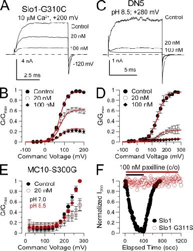Figure 8. Other tests of factors influencing paxilline block. (A) Paxilline blocks construct Slo1-G310C. Traces show reduction of Slo1-G310C currents by the indicated paxilline concentrations with 10 µM of cytosolic Ca2+ and steps to +200 mV. (B) G-V curves are shown for paxilline block of Slo1-G310C. Red line corresponds to fit of voltage-independent block of open and closed states with Kb = 34.6 ± 1.8 nM. (C) Paxilline blocks DN5. Traces show paxilline block of DN5 in which the Slo1 cytosolic structure is replaced by Slo3. Currents were activated with cytosolic pH 8.5 with steps to +280 mV. (D) G-V curves are shown for paxilline block of DN5. Red lines show a fit with Kb = 6.3 ± 0.3 nM with z = 0 e. (E) Paxilline block on MC10-S300G G-V curves is similar at either pH 7.0 (black) or pH 8.5 (red). In both cases, 20 nM paxilline produces similar block. (F) Points plot the peak current during the application of 100 nM paxilline applied to outside-out patches expressing either Slo1 (black) or Slo1-G311S (red). Currents were activated by steps to +200 mV with 10 µM of pipette Ca2+ with a holding potential of 0 mV.