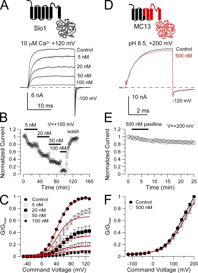 Figure 1. Paxilline blocks Slo1, but not Slo3 current. (A) Traces show block of Slo1 by paxilline, and the general topology of the Slo1 α subunit is shown on the top. Currents were activated by a step to +120 mV in an inside-out patch exposed to 10 µM Ca2+ with the indicated concentrations of paxilline. The holding potential was 0 mV, but the command steps were preceded by a brief 10-ms step to −140 mV. (B) The time course of paxilline block and unblock of Slo1 current is illustrated. Steps were to +100 mV. (C) G-V curves were generated from steady-state current levels for recordings in the absence and presence of paxilline (n = 4–7 patches). For this set of data, paxilline was applied at increasing concentrations, and full washout was not usually achieved (see B). Red lines correspond to a fit of Eq. 1, with Kb = 10.6 ± 0.49 nM with zc = zo = 0 e. (D) 500 nM paxilline is without effect on MC13 currents activated at +200 mV with pH 8.5. The composition of the MC13 construct is schematized at the top with Slo3 sequence shown in red. (E) MC13 currents are unaltered by 500 nM paxilline during 6 min of application. (F) 500 nM paxilline has little effect on MC13 G-V curves.