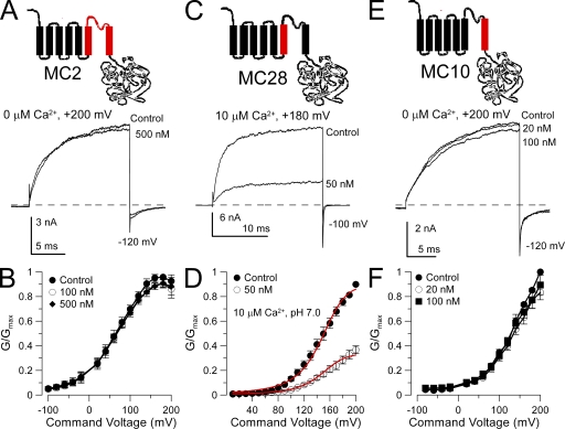 Figure 3. Replacement of the Slo1 S6 segment with the Slo3 sequence abolishes sensitivity to paxilline. (A) Replacing the Slo1 S5–P loop–S6 segment with the homologous Slo3 sequence (chimera MC2) abolishes paxilline sensitivity. The MC2 construct is diagrammed at the top. Traces show MC2 currents activated with 10 µM Ca2+ at +200 mV with and without 500 nM paxilline. (B) Paxilline has no effect on MC2 G-V curves (n = 4 patches). (C) Paxilline sensitivity persists after replacement of the Slo1 S5 segment with the homologous Slo3 sequence. The MC28 construct is diagrammed at the top. Traces show MC28 currents activated with 10 µM Ca2+ at +180 mV with and without paxilline. (D) G-V curves for MC28 with and without 50 nM paxilline (n = 3 patches) are shown. Red lines correspond to a fit of Eq. 1, with Kbc = Kbo = 30.4 ± 1.7 nM with no voltage dependence. (E) Paxilline sensitivity is lost when the Slo1 S6 segment is replaced with the homologous Slo3 sequence. The MC10 construct is diagrammed at the top. Traces show MC10 currents activated with 0 Ca2+ at +200 mV with and without paxilline. MC10 is strongly activated by Ca2+, but like Slo3 and MC13, it is also strongly blocked by µM Ca2+. (F) G-V curves are shown for MC10 with and without paxilline (n = 4 patches).