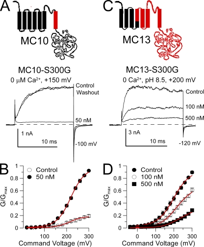 Figure 7. Paxilline sensitivity is restored in constructs with a Slo3 S6 by a glycine at position S300. (A) Paxilline blocks MC10-S300G. 50 nM paxilline markedly inhibits MC10-S300G currents activated at +150 mV with 0 Ca2+. (B) G-V curves are plotted for MC10-S300G with and without 50 nM paxilline (n = 4 patches). Red lines are a fit of Eq. 2 with Kb = 13.1 ± 0.6 nM and no voltage dependence. (C) Paxilline more weakly blocks MC13-S300G. Traces show MC13-S300G currents activated at pH 8.5 at +200 mV. Inhibition occurs with high concentrations of paxilline. (D) G-V curves are plotted for MC13-S300G with and without paxilline (n = 3 patches). Red lines are a fit of Eq. 2 with Kb = 170.2 ± 7.2 nM and no voltage dependence.