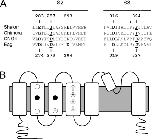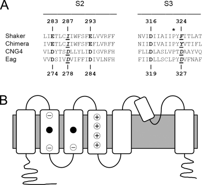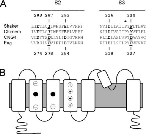 Figure 1. Alignment of S2 and S3 sequences from Shaker, the Kv1.2/Kv2.1 chimera, Drosophila eag, and rat CNG4 (A) (Tempel et al., 1987; Warmke et al., 1991; Chandy and Gutman, 1995; Nelson et al., 1999; Long et al., 2007). Acidic residues conserved throughout the voltage-gated channel superfamily are shown in bold; positions of acidic residues conserved only in the eag and CNG subfamilies are underlined and shown in bold italics. The asterisk (*) above the conserved proline in S3 indicates the division between S3a and S3b (Alabi et al., 2007). Numbers corresponding to the Shaker and eag sequences are provided above and below the alignment, respectively. (B) Cartoon of the membrane topology of a voltage-gated K+ channel subunit shows the approximate locations of the binding site residues (filled circles) (Silverman et al., 2000). Circled negative signs indicate positions occupied by acidic residues throughout the voltage-gated channel superfamily (Chandy and Gutman, 1995). Circled positive signs indicate charge-moving arginine residues in the S4 segment (Aggarwal and MacKinnon, 1996; Seoh et al., 1996). Filled circles indicate positions occupied by acidic residues only in the eag and CNG channel subfamilies (Kaupp et al., 1989; Dhallan et al., 1990; Warmke and Ganetzky, 1994). |