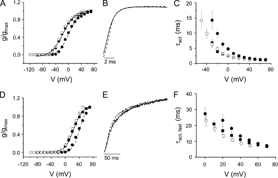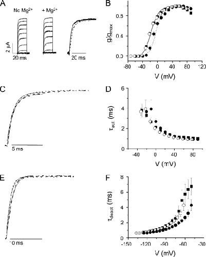 Figure 4. Single mutants I287D (A–C) and F324D (D–F) are insensitive to extracellular Mg2+. (A and D) Mg2+ shifts the voltage dependence of activation in (A) I287D and (D) F324D channels. Values of g/gmax obtained in the absence (■) or presence (•) of Mg2+ were plotted versus voltage. Data are provided as mean ± SEM; n = 6 (I287D) or 8–9 (F324D). Data were fitted with a single Boltzmann function. Values of V1/2 and apparent valence for I287D in the absence and presence of Mg2+ were −20 ± 2 mV and 1.7 ± 0.1, and 0 ± 1 mV and 1.5 ± 0.2, respectively. Values of V1/2 and apparent valence for F324D in the absence and presence of Mg2+ were 21 ± 1 mV and 2.1 ± 0.2, and 40 ± 1 mV and 2.5 ± 0.3, respectively. To correct for the field effect of Mg2+, g/gmax values obtained in Mg2+ were shifted by −20 mV and replotted (○). (B and E) Representative I287D (B) and F324D (E) currents recorded at +20 mV in the absence (solid trace) and +40 mV in the presence (dashed trace) of Mg2+ have been scaled and overlaid. Values of τact (I287D) or τact,fast (F324D) obtained in the absence (+20 mV) and presence (+40 mV) of Mg2+ did not differ significantly and were 2 ± 0.1 and 2 ± 0.1 ms for I287D, and 17 ± 2 and 14 ± 1 ms for F324D, respectively. (C and F) Mg2+ does not affect activation kinetics in (C) I287D or (F) F324D. I287D and F324D current traces recorded in the absence (■) or presence (•) of Mg2+ were fitted with single- (I287D) or double- (F324D) exponential functions. Values of τact were plotted versus voltage. In F, only the major, fast kinetic component of F324D activation is shown. Data are shown as mean ± SEM; n = 6 (I287D) or 3 (F324D). To correct for the field effect of Mg2+, τact values obtained in Mg2+ were shifted by −20 mV and replotted (○). |