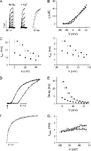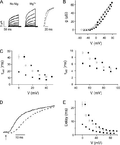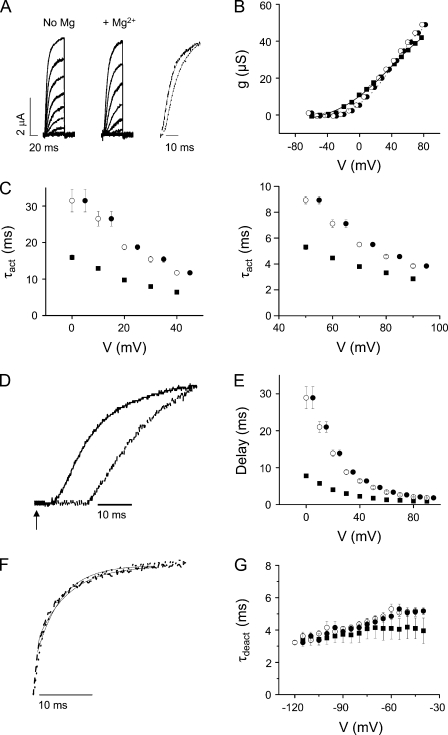 Figure 5. E283 is not required for Mg2+ modulation of activation time course in I287D+F324D. (A) E283A+I287D+F324D currents were recorded in the absence (left) or presence (middle) of Mg2+. (Right) After approximate correction for the nonspecific field effect of Mg2+ (see B), representative current traces recorded at +20 mV in the absence (dashed trace) or at +30 mV in the presence (dotted trace) of Mg2+ have been scaled and overlaid. Single-exponential fits to the data are shown (solid curves). (B) Mg2+ shifts the voltage dependence of activation in E283A+I287D+F324D. Because the conductance of E283A+I287D+F324D channels did not saturate in the tested voltage range, un-normalized conductance values from a representative experiment are shown. Data were obtained in the absence (■) or presence (•) of Mg2+, plotted versus voltage, and fitted with a single Boltzmann function without constraining the maximum conductance value. Fitted parameters from individual experiments were averaged and are provided as mean ± SEM; n = 8. Values of V1/2 and apparent valence in the absence and presence of Mg2+ were 36 ± 3 mV and 0.8 ± 0.07, and 44 ± 4 mV and 0.9 ± 0.07, respectively. To correct for the field effect of Mg2+, conductance values obtained in Mg2+ were shifted by −8 mV and replotted (○). (C) Mg2+ slows activation kinetics. (Left) Values of τact obtained in the absence (■) or presence (•) of Mg2+ have been plotted versus voltage from 0 to +48 mV. Data are provided as mean ± SEM; n = 8. To correct for the field effect of Mg2+, τact values obtained in Mg2+ were shifted by −8 mV and replotted (○). Shifted τact values obtained with Mg2+ and τact values obtained without Mg2+ differed significantly; P < 0.05. (Right) Values of τact obtained at voltages from +50 to +98 mV are shown on an expanded scale; symbols as described above. To correct for the field effect of Mg2+, τact values obtained in Mg2+ were shifted by −8 mV and replotted (○). Shifted τact values obtained with Mg2+ and τact values obtained without Mg2+ differed significantly; P < 0.05. (D) Representative current traces recorded at +20 mV in the absence (solid trace) or at +28 mV in the presence (dashed trace) of Mg2+ are shown on an expanded time scale to highlight the delay before pore opening. The arrow indicates start of voltage pulse (t = 0). Values of τact measured in the absence (+20 mV) and presence (+28 mV) of Mg2+ were 11.3 ± 0.5 and 18.5 ± 1.2 ms, respectively, and differed significantly (P < 0.05; n = 8). Measured delay values were 3.3 ± 0.3 ms at +20 mV in the absence and 9.1 ± 0.2 ms at +28 mV in the presence of Mg2+ and differed significantly (P < 0.05; n = 8). (E) Mg2+ increases the delay before activation of the ionic conductance in E283A+I287D+F324D. The delay before pore opening was measured in the absence (■) or presence (•) of Mg2+ and plotted versus voltage. Data are provided as mean ± SEM; n = 10. To correct for the field effect of Mg2+, delays measured in the presence of Mg2+ were shifted by −8 mV and replotted (○). Shifted delay values obtained with Mg2+ and delay values obtained without Mg2+ differed significantly; P < 0.05. |