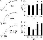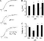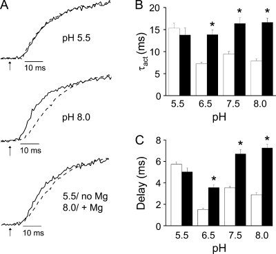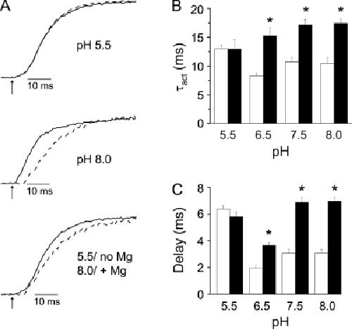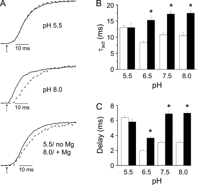 Figure 7. Low pH abolishes Mg2+ modulation of activation kinetics in E283A+I287D+F324D channels. (A) Representative currents recorded at pH 5.5 (top) or pH 8.0 (middle) at +20 mV in the absence (solid trace) or at +30 in the presence (+20 mV at pH 5.5 only) (dashed trace) of Mg2+ have been scaled and overlaid. (Bottom) Representative currents recorded at pH 5.5 in the absence of Mg2+ (solid trace; +20 mV) or at pH 8.0 in the presence of Mg2+ (dashed trace; +30 mV) have been scaled and overlaid. Arrows indicate start of voltage pulse (t = 0). (B) Bar graph shows τact values measured at pH 5.5, 6.5, 7.5, or 8.0 in the absence (open bars; +20 mV) or presence (filled bars; +30 mV, except for +20 mV at pH 5.5) of Mg2+. Data are provided as mean ± SEM; n = 8–11. Asterisk (*), τact values measured in the presence and absence of Mg2+ differ significantly; P < 0.05 by ANOVA. Values of τact for E283A+I287D+F324D in the absence of Mg2+ were 13 ± 1 ms (pH 5.5), 8 ± 1 ms (pH 6.5), 11 ± 1 ms (pH 7.5), and 10 ± 1 ms (pH 8). Values of τact for E283A+I287D+F324D in the presence of Mg2+ were 13 ± 2 ms (pH 5.5), 15 ± 1 ms (pH 6.5), 17 ± 1 ms (pH 7.5), and 17 ± 1 ms (pH 8). (C) Bar graph shows delay before pore opening measured at pH 5.5, 6.5, 7.5, or 8.0 in the absence (open bars; +20 mV) or presence (filled bars; +30 mV, except for +20 mV at pH 5.5) of Mg2+. Data are provided as mean ± SEM; n = 8–14. Asterisk (*), delay values measured in the presence and absence of Mg2+ differ significantly; P < 0.05 by ANOVA. Values of the delay for E283A+I287D+F324D in the absence of Mg2+ were: pH 5.5, 6.4 ± 0.2 ms; pH 6.5, 2.0 ± 0.2 ms; pH 7.5, 3.1 ± 0.3 ms; pH 8.0, 3.1 ± 0.2 ms. Values of the delay for E283A+I287D+F324D in the presence of Mg2+ were: pH 5.5, 5.8 ± 0.4 ms; pH 6.5, 3.7 ± 0.2 ms; pH 7.5, 6.9 ± 0.4 ms; pH 8.0, 7.0 ± 0.3 ms. |