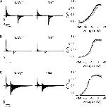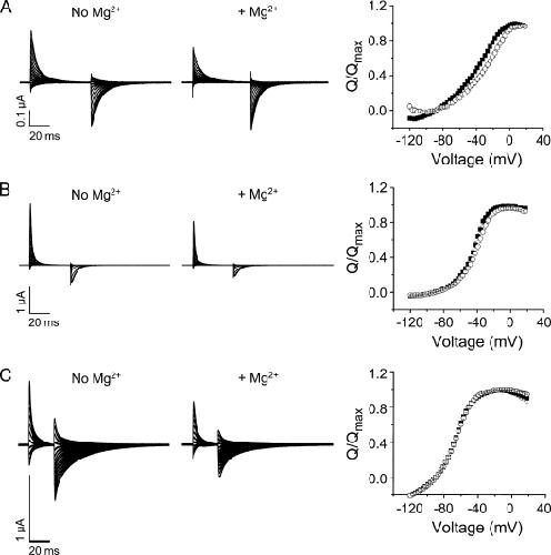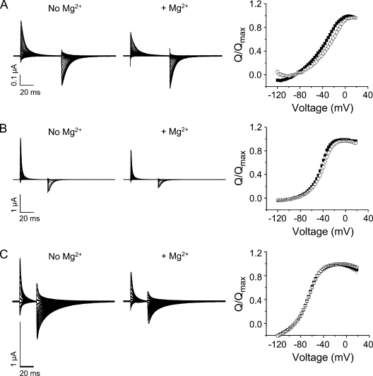 Figure 8. Mg2+ shifts the voltage dependence of gating charge movement in I287D+F324D channels, but not in control (W434F) or I287D channels. Gating currents were recorded from (A) I287D+F324D, (B) W434F, or (C) I287D channels in the absence (left) or presence (middle) of Mg2+. From a holding potential of −90 mV, 60-ms (A), 40-ms (B), or 25-ms (C) test pulses to voltages between −120 and +18 mV were applied in 3-mV increments. Every third pulse is shown. (Right) ON gating currents recorded in the absence (■) or presence (○) of Mg2+ were integrated to obtain the gating charge (Q), which was normalized to the maximum charge obtained in the experiment, and plotted versus voltage. Data were fitted with the sum of two Boltzmann functions to obtain values for V1/2 and apparent valence (z) for the q1 and q2 components of gating charge. Fitted parameters are provided in Table I. |