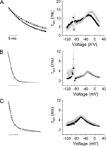 Figure 9. Mg2+ slows gating charge movement in I287D+F324D channels, but not in control (W434F) or I287D channels. Gating currents were recorded from (A) I287D+F324D, (B) W434F, or (C) I287D channels in the absence or presence of Mg2+ using the pulse protocols described in the Fig. 8 legend. (Left) Representative ON gating current traces obtained at −9 mV in the absence (solid trace) or presence (dashed trace) of Mg2+ have been scaled and overlaid. (Right) Gating current traces recorded in the absence (■) or presence (○) of Mg2+ were fitted with a single-exponential component to obtain values for τon, which have been plotted versus voltage. In A, values of τon measured in the presence andabsence of Mg2+ differed significantly from −21 to +18 mV; P < 0.05 by ANOVA. Values of τon obtained at −9 mV are shown in Table II. |