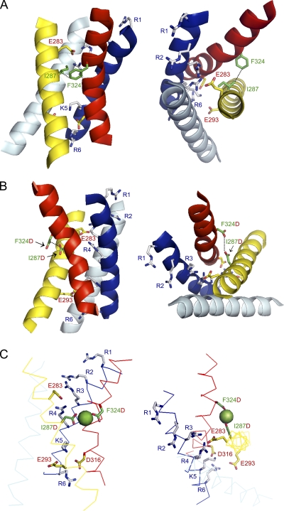Figure 10. Threaded models of Shaker-IR and I287D+F324D based on Kv1.2/Kv2.1 chimera structure. (A) I287 and F324 are closely apposed in threaded Shaker-IR model. Side (left) and top (right) views are shown. S1 (light blue), S2 (yellow), S3 (red), and S4 (dark blue) transmembrane segments are pictured in cartoon form. Selected side chains are shown: I287 in S2 and F324 in S3b (green); acidic residues E283 and E293 in S2 and D316 in S3 (yellow and red); basic residues R362, R365, R368, R371, K374, and R377 in S4 (gray and blue). A subset of side chains are labeled to provide landmarks. S4 positively charged residues are labeled with a generic nomenclature (R1–R6). Dotted black line connects atoms of I287 and F324 that are ∼4.0 Å apart. (B) Aspartate residues introduced at I287D and F324D are closely apposed and located at the interface between the voltage sensor domain and the hydrophobic core of the membrane. Side (left) and top (right) views of I287D+F324D double-mutant model. Color code and labeling are the same as in A, except that the mutations I287D and F324D are shown in green and red. Dotted black line connects oxygen atoms of D287 and D324 that are ∼3.8 Å apart. (C) I287D and F324D are able to simultaneously coordinate a Mg2+ ion. Side (left) and top (right) views of I287D+F324D double-mutant model. Transmembrane segments S1–S4 are shown in ribbon form using the same color code as in A. Bound Mg2+ ion is shown as a green sphere. Color code and labeling are the same as in B. The figure was made using PyMOL (DeLano, 2002). |