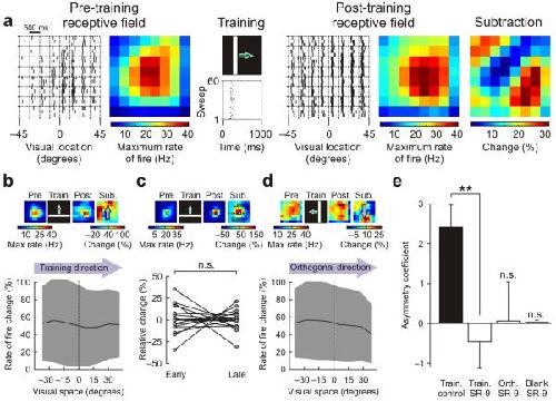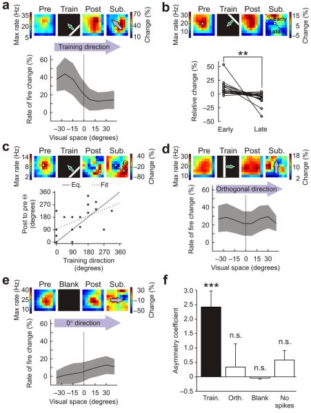Figure 2. Moving stimuli instruct asymmetric changes in tectal receptive fields. (a) Training produced asymmetric changes in receptive fields that reflected the direction of movement of the stimulus. An example cell is shown at the top. Population data (n = 18 cells) is below, showing the mean change in the rate of fire (± s.e.m., shaded region) across visual space, when analyzed in the direction of the training stimulus (arrows). Pre, pre-training; post, post-training; sub, subtraction. (b) Changes around the center of the receptive fields exhibited significant asymmetries. Each pair of points represents the relative change of a cell's receptive field in regions activated by the training stimulus before the center (early) versus after the center (late) (**P < 0.01, paired t test.). (c) The direction of training-induced shifts in receptive field centers (indicated here as Θ) was significantly correlated with the direction of movement of the training stimuli (Pearson's r = 0.52, P < 0.05). (d) Receptive field changes in the direction orthogonal to the movement of the training stimuli were symmetric. (e) Receptive fields did not show changes in the absence of training stimuli (n = 21 cells). (f) Asymmetry coefficients (Online Methods) were significantly greater than zero in the direction of training (train), but not in the direction orthogonal to training (orth), for untrained cells at 0° (blank) or for cells that did not spike during training (no spikes, n = 2 cells). Data shown are mean ± s.e.m. (***P < 0.001, n.s. = nonsignificant (P > 0.05), t test.)