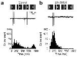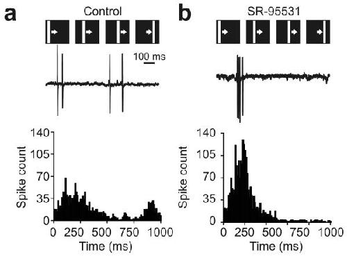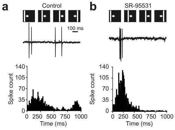 Figure 5. GABA blockade boosts temporal correlations between tectal neurons during training. (a) As the example cell illustrates (top), control cells fired action potentials at a variety of times during presentation of each drifting bar stimulus and the temporal pattern of spikes differed between cells. This was reflected by the broad shape of the spike-time histogram generated from all responses in control neurons (bottom, n = 18 cells). (b) In contrast, the temporal profiles of responses recorded during GABAA receptor blockade were much more similar across cells. As the example shows, SR-95531 cells exhibited spikes over a relatively short window of time during each presentation of the drifting bar stimulus. This was reflected in the narrow spike-time histogram that was generated from all responses in the SR-95531 population (n = 19 cells) and increased temporal correlations calculated from spike-time histograms of pairs of neurons.