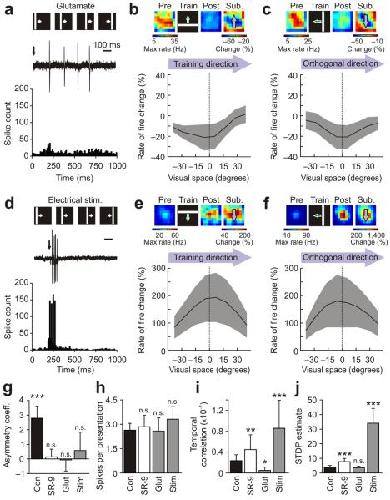 Figure 6. Receptive field changes are altered by manipulations of spike timing during training. (a) Glutamate puffs delivered to the tectum at the start of each presentation of the training stimulus (arrow) increased variability in spike times (n = 9 cells). (b) In the direction of the training stimulus, receptive field changes were no longer asymmetric and showed depression. Data are mean ± s.e.m. (c) Changes in the orthogonal direction were similar. (d) Direct electrical stimulation of the tectum (arrow) shifted the pattern of spike times so that cells spiked over a narrow time window (n = 11 cells). (e) Under these conditions, instructive learning was abolished; receptive field changes in the direction of training showed potentiation, but no asymmetry. (f) A similar profile was seen in the orthogonal direction. (g) GABAA receptor blockade, glutamate puffing and tectal stimulation all abolished asymmetric training–induced changes. Data are mean ± s.e.m., with comparison to 0 via t tests. (h) Spikes per presentation of the training stimulus were not significantly different between the conditions. Data are mean ± s.e.m., with one-way ANOVA. (i) Compared with control cells, GABAA receptor blockade and stimulation both caused a significant increase in the temporal correlation between pairs of neurons. Glutamate application decreased temporal correlations. Data are medians with 95% confidence intervals. (j) Monte-Carlo estimates of STDP between tectal cells revealed that cells in the SR-95531 and stimulation conditions were predicted to have significantly greater potential for STDP. Data are median with 95% confidence interval. Kruskal-Wallis with pair-wise comparisons to controls were used in i and j (*P < 0.05, **P < 0.01 and ***P < 0.001).