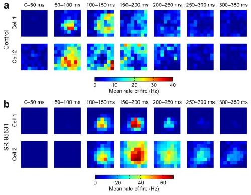 Figure 7. GABAergic circuits reduce spatiotemporal correlations in tectal receptive fields. (a) Receptive fields were analyzed in the temporal domain by separating responses according to when they occurred after the onset of the flashed stimuli. Data from two representative control cells are shown for seven different time bins (each 50 ms long) following the onset of the stimuli. As a population, control cells showed greater variety in their responses at different times and different locations of visual space (n = 21 cells). Associated with this variability was the fact that stimuli in some regions of a control cell's receptive field would typically elicit early responses (for example, 50–100 ms post-stimulus), whereas stimuli in other locations would generate later responses (for example, 200–250 ms post-stimulus). (b) In contrast with control cells, the population of cells recorded under GABAA receptor blockade showed similar responses at different times and locations of visual space (n = 7 cells). This is illustrated with data from two representative SR-95531 cells. Maximal responses for the SR-95531 cells occurred between 100–200 ms in post-stimulus time and typically the same receptive field locations elicited both early spikes and later spikes. The result was greater uniformity in the spatiotemporal profile of the responses of different cells in the SR-95531 condition.